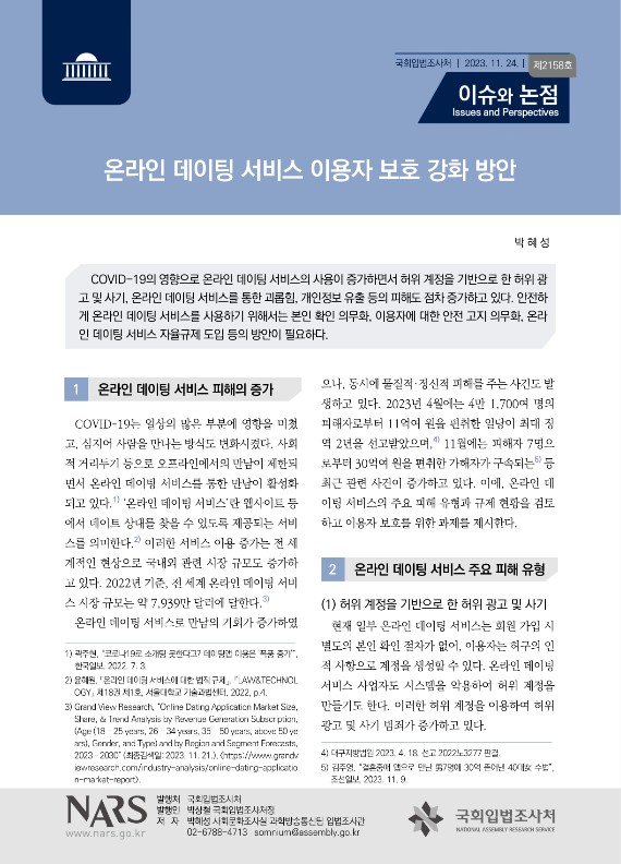 COVID-19의 영향으로 온라인 데이팅 서비스의 사용이 증가하면서 허위 계정을 기반으로 한 허위 광고 및 사기,? 온라인 데이팅 서비스를 통한 괴롭힘, 개인정보 유출 등의 피해도 점차 증가하고 있다. 안전하게 온라인 데이팅 서비스를 사용하기 위해서는 본인 확인 의무화, 이용자에 대한 안전 고지 의무화, 온라인 데이팅 서비스 자율규제 도입 등의 방안이 필요하다.