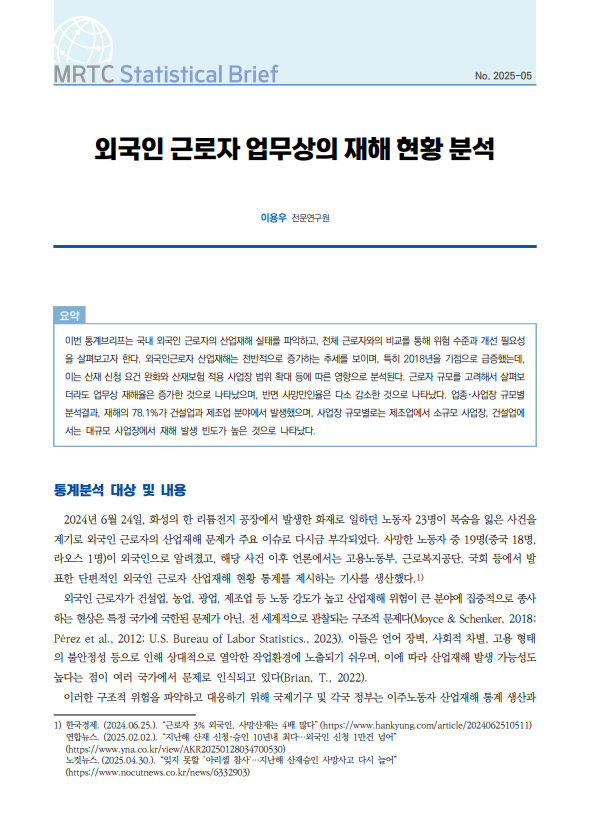 〈표 5〉 사업장규모별 외국인 근로자 산재 승인 현황 (근로복지공단) 7