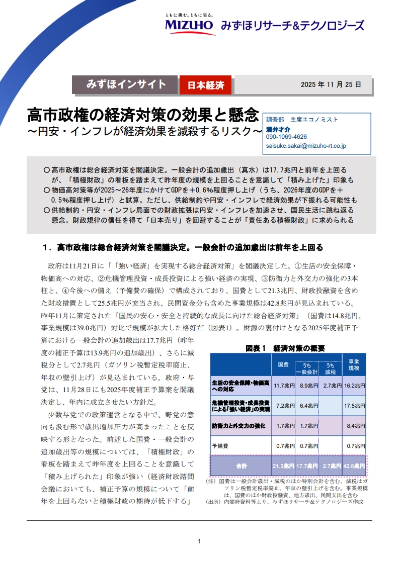 1.高市政権は総合経済対策を閣議決定。一般会計の追加歳出は前年を上回る 1