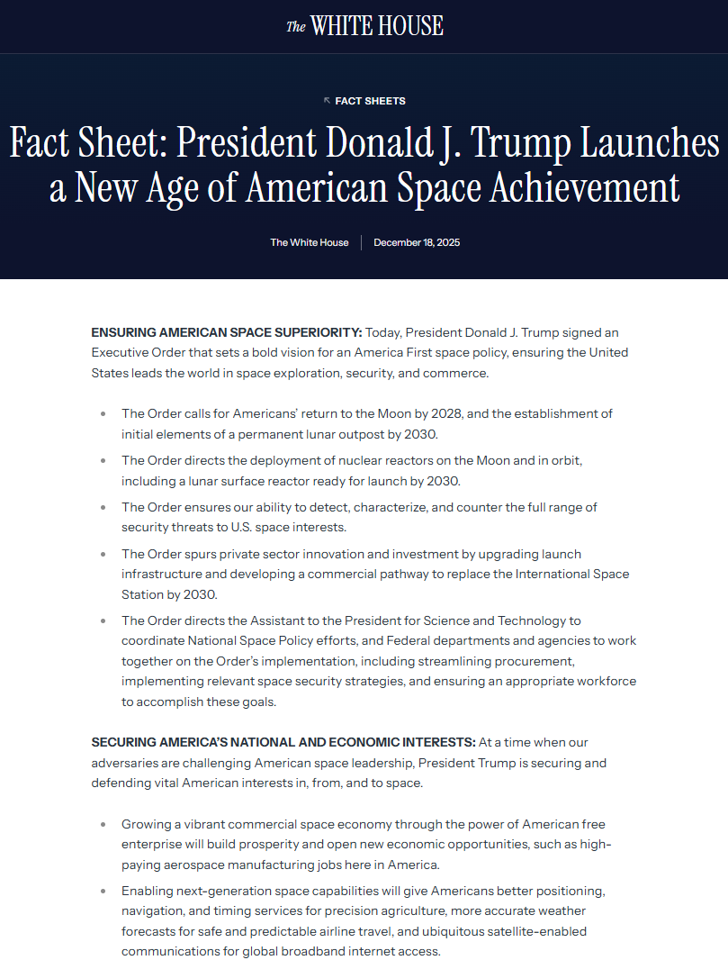 [참고] Fact Sheet: President Donald J. Trump Launches a New Age of American Space Achievement (2025.12.18.) / The White House