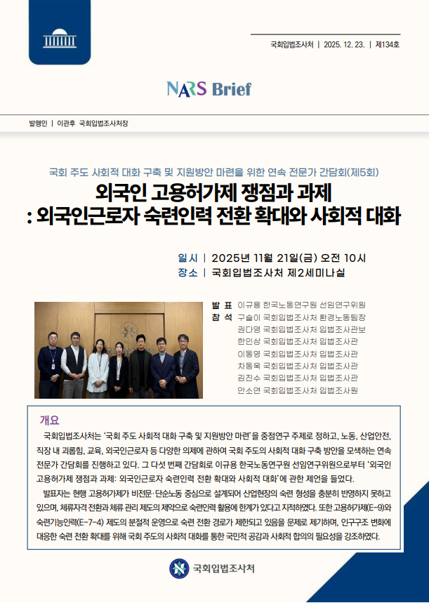 외국인 고용허가제 쟁점과 과제 : 외국인근로자 숙련인력 전환 확대와 사회적 대화 : 국회 주도 사회적 대화 구축 및 지원방안 마련을 위한 연속 전문가 간담회(제5회)