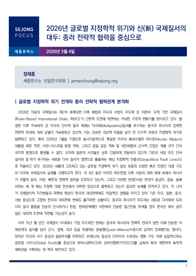 2026년 글로벌 지정학적 위기와 신(新) 국제질서의 대두 : 중러 전략적 협력을 중심으로
