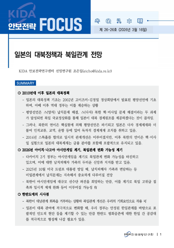 - 일본이 대북 관여에 적극적으로 변화할 때, 우리 정부는 안정된 한일관계를 바탕으로 포괄적인 인도적 현안 등을 제기할 수 있는 만큼 한반도 평화