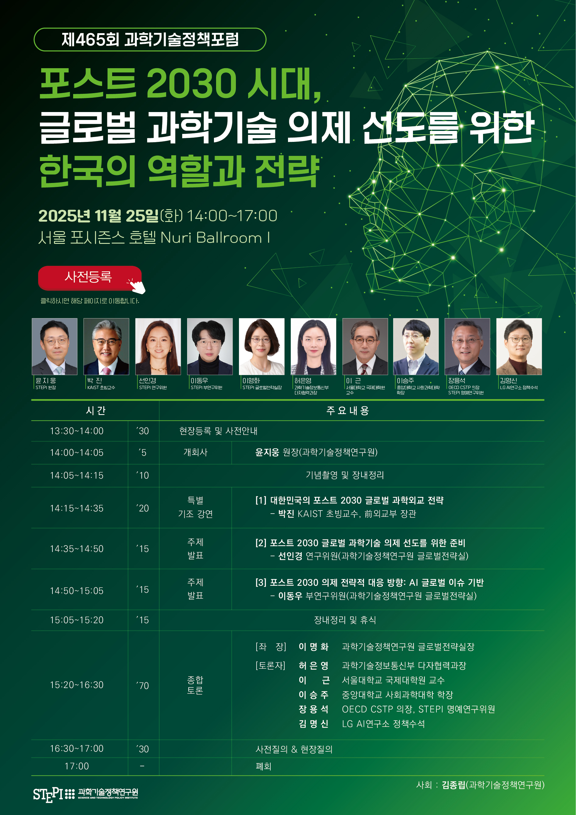 [제465회 과학기술정책포럼] 포스트 2030 시대, 글로벌 과학기술 의제 선도를 위한 한국의 역할과 전략