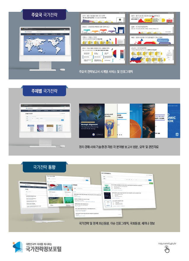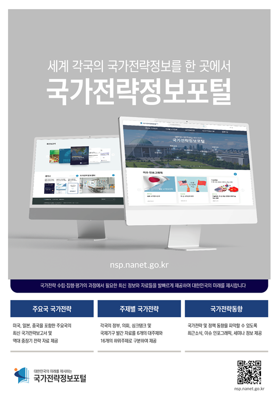 국가전략정보포털은 G7 국가를 포함한 15개국의 국가전략 및 정책연구자료, 국내·외 최신 동향, 현안 이슈 인포그래픽, 국회 발간자료 및 국가전략 세미나 소식을 제공합니다.
