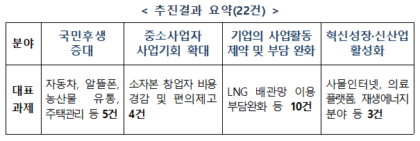□ 공정거래위원회(이하 '공정위')는 12월 7일 국정현안관계장관회의에서 국민 후생증대, 중소기업 사업기회 확대, 기업의 사업활동 제약 완화 등이 포함된 「2023년 경쟁제한적 규제 개선방안」을 논의 후 발표함. 공정위는 매년 신규진입을 저해하거나 사업활동을 제약하는 정부 내 각종 규제를 발굴·개선해 오고 있으며, 올해는 의료, 자동차검사, 아파트 관리, 천연가스, 사물인터넷, 소자본 창업, 산업단지 등 국민생활 및 기업활동 촉진과 관련된 분야에서 총 22건의 규제개선 방안을 마련함
