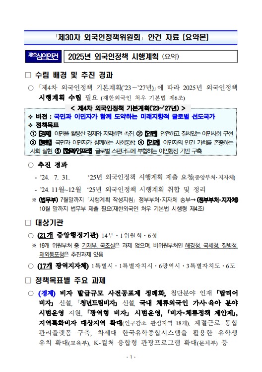 「제30차 외국인정책위원회」 안건 자료 (요약본)