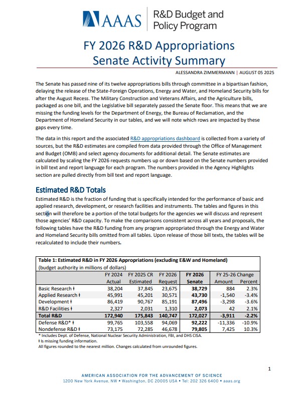 (2026 회계연도 R&D 예산 상원 활동 요약)