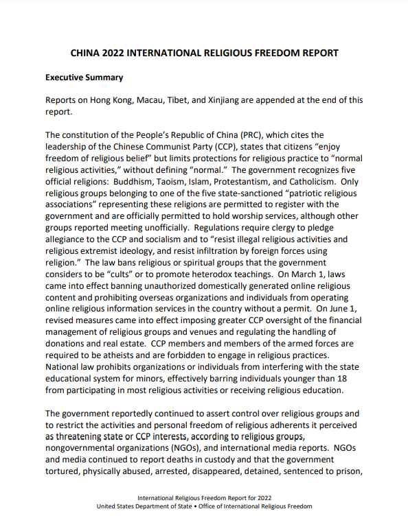 China 2022 International Religious Freedom Report
