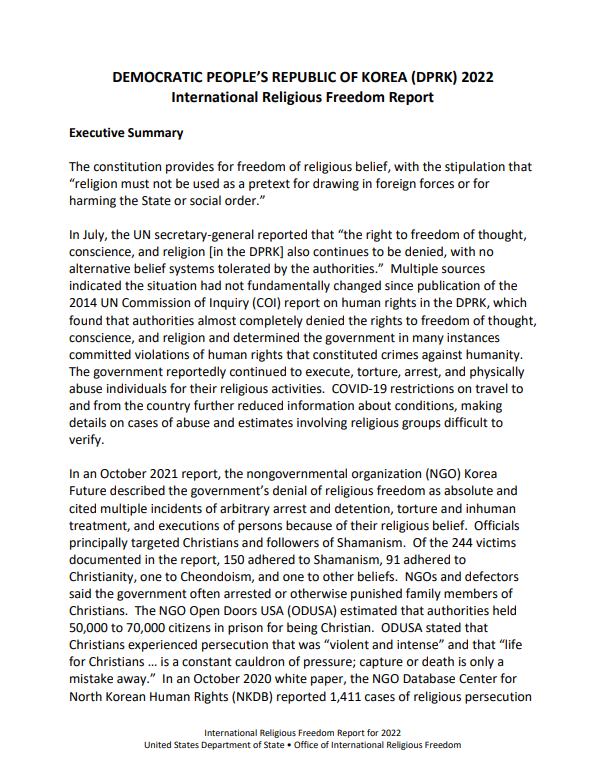(조선민주주의인민공화국 2022 국제종교자유 보고서)