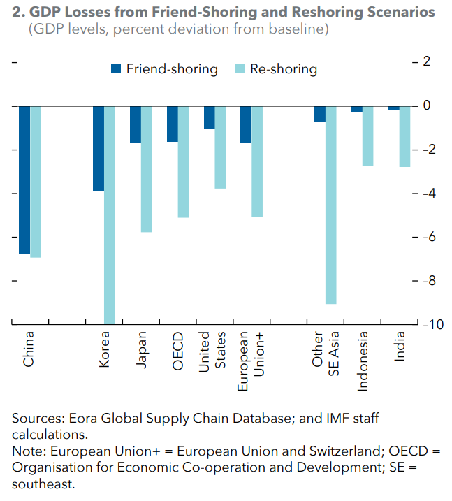 □ 프렌드쇼어링 상황에서 중국은 중국산 제품에 대한 수요 감소와 공급망 변동에 따른 생산 비용 상승 등으로 인해 장기적으로 GDP가 6.8% 줄어들 것으로 예상됨. 한국은 이보다는 낮지만(4%) 중국과의 관련도가 높은 만큼 다른 경제권보다는 비교적 큰 피해를 볼 것으로 분석됨. 한편 IMF는 중국과 OECD가 서로에 대해서뿐만 아니라 모든 국가를 상대로 비관세 무역장벽을 강화하는 '리쇼어링(reshoring·해외진출 기업의 국내 복귀) 상황에서는 중국의 GDP 감소율이 6.9%, 한국이 10% 가량 감소하는 것으로 평가됨