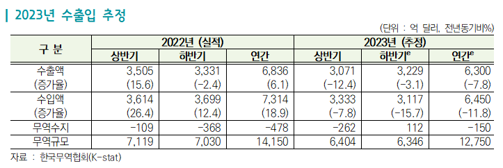 □ 한국무역협회는 11월 30일 「2023년 수출입 평가 및 2024년 전망」 보고서를 발표하고, 2023년 우리 수출은 전년 대비 7.8% 감소한 6,300억 달러, 수입은 11.8% 감소한 6,450억 달러, 무역수지는 150억 달러 적자로 추정된다고 밝혔음