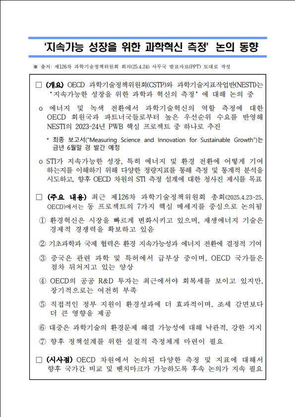 '지속가능 성장을 위한 과학혁신 측정' 논의 동향