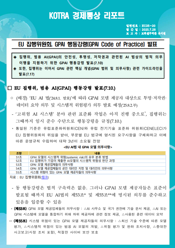 EU 집행위원회, GPAI 행동강령(GPAI Code of Practice) 발표