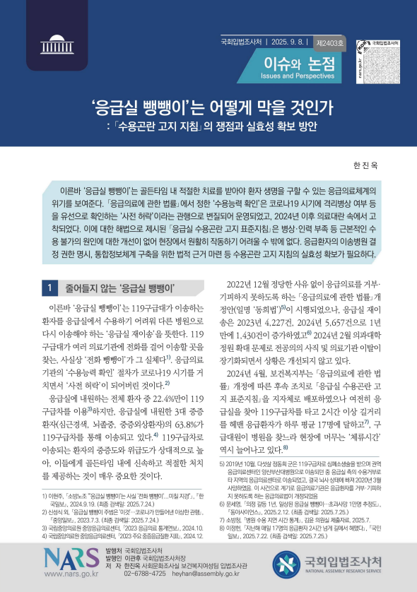 '응급실 뺑뺑이'는 어떻게 막을 것인가 : 「수용곤란 고지 지침」의 쟁점과 실효성 확보 방안