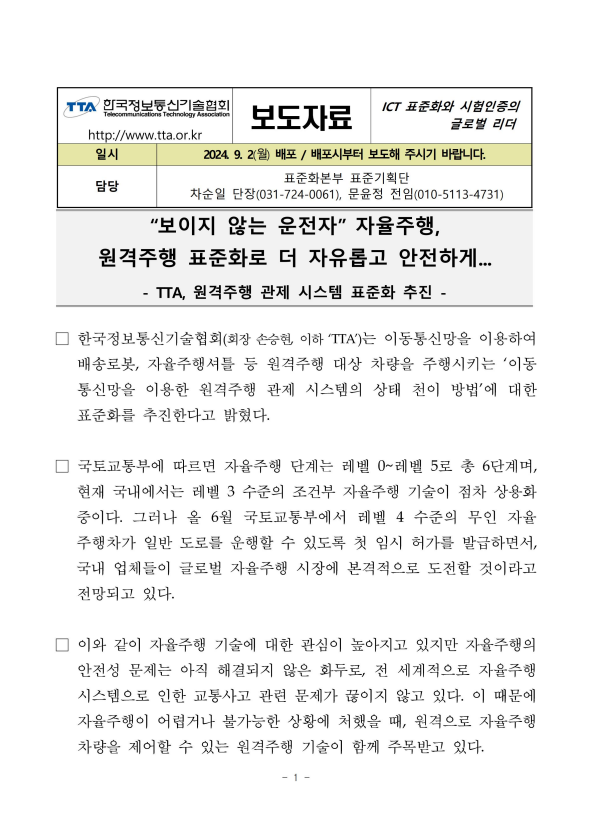 "보이지 않는 운전자" 자율주행, 원격주행 표준화로 더 자유롭고 안전하게 : TTA, 원격주행 관제 시스템 표준화 추진