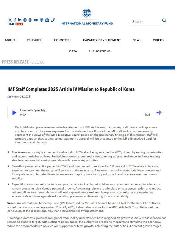 □ IMF는 2025년 9월 11~24일 방한한 라훌 아난드 단장을 포함한 협의단이 한국 경제를 평가한 ‘2025년 연례협의(Article IV)’ 미션을 마무리하고 성명을 발표함