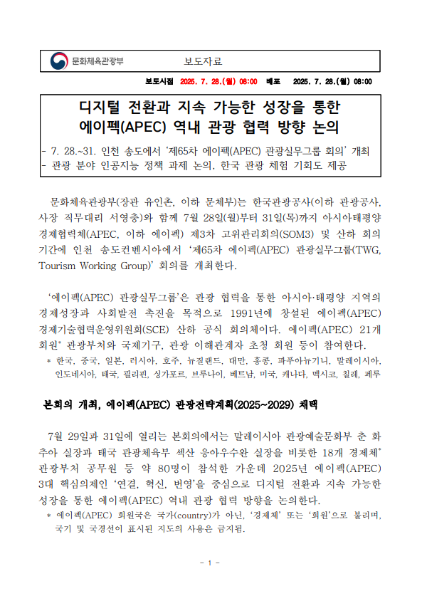 디지털 전환과 지속 가능한 성장을 통한 에이펙(APEC) 역내 관광 협력 방향 논의