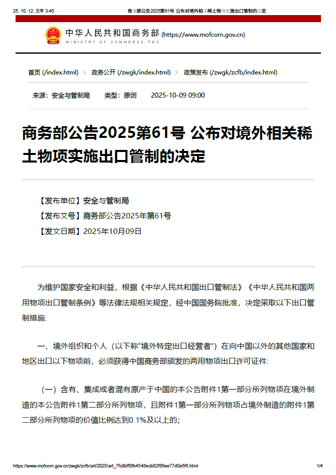 商务部公告2025第61号 公布对境外相关稀土物项实施出口管制的决定