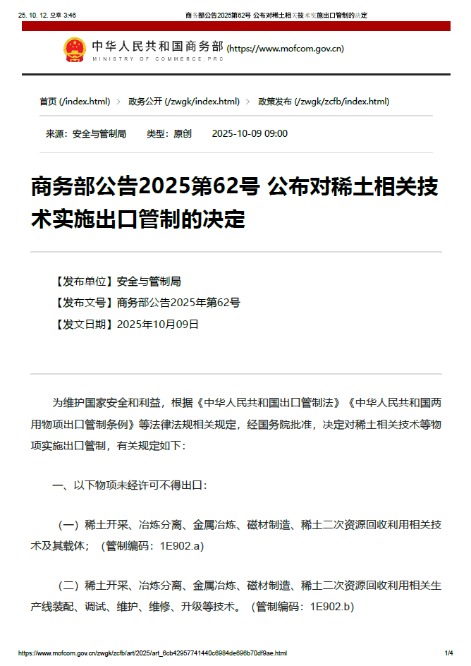 商务部公告2025第62号 公布对稀土相关技术实施出口管制的决定