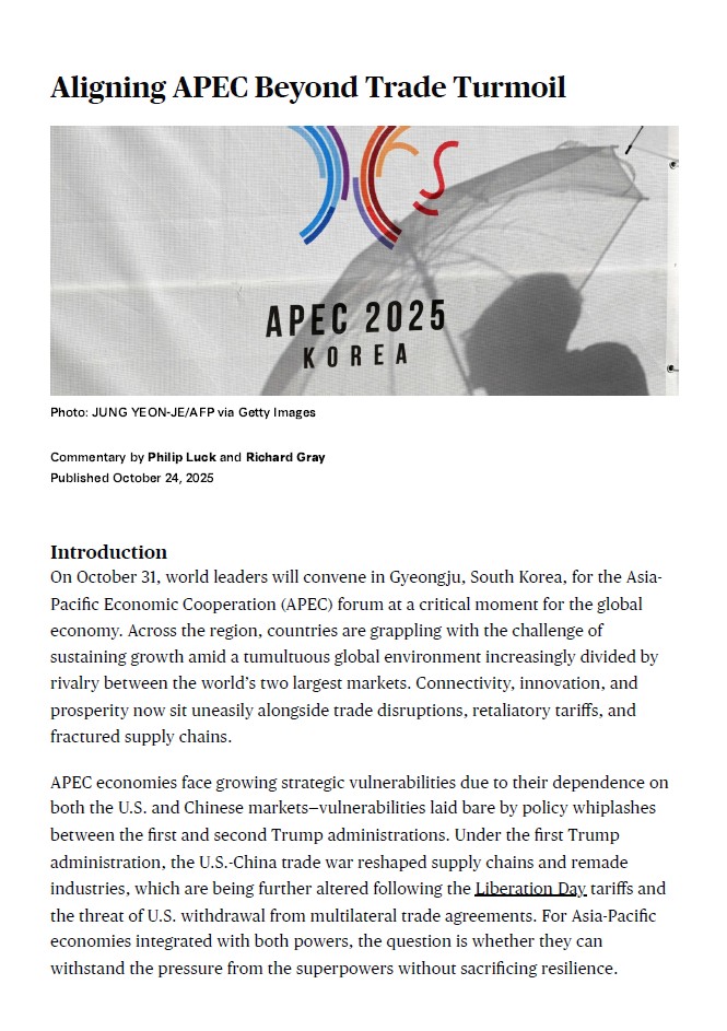 □ 전략국제문제연구소(CSIS)의 전문가들은 경주 APEC 정상회의를 앞두고 작성한 코멘터리 「Aligning APEC Beyond Trade Turmoil」를 통해 아시아-태평양 경제협력체(APEC)를 단순한 무역협의체가 아닌 경제안보 중심의 지역 협력 플랫폼으로 재정립할 것을 제안하며, 미·중 경쟁이 심화되는 상황에서 APEC이 위기관리·공급망 복원력·다자적 경제협력의 중심축으로 자리 잡아야 한다고 강조함