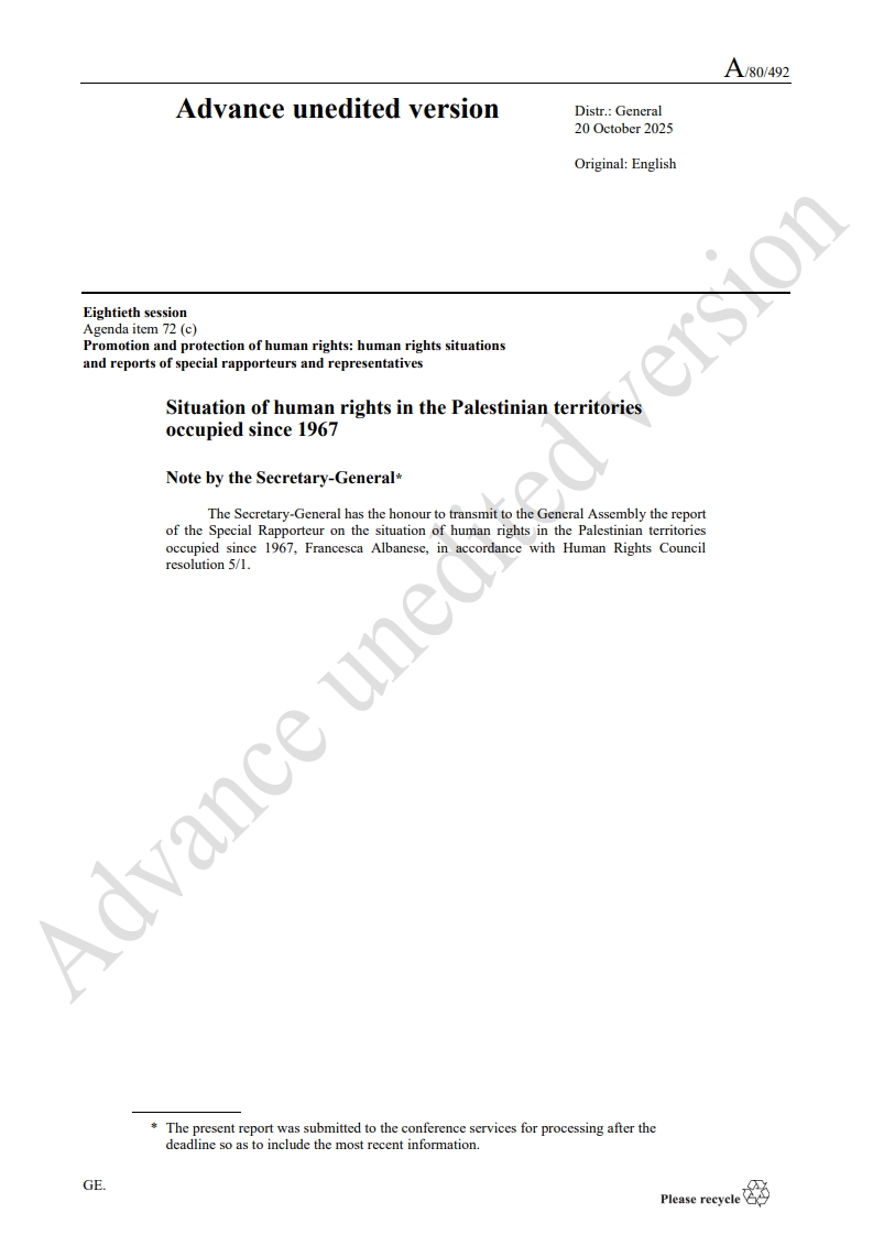 ㅇ 프란체스카 알바네제 유엔 팔레스타인 점령지 특별보고관이 「가자 집단학살: 집단적 범죄」 보고서를 발표함