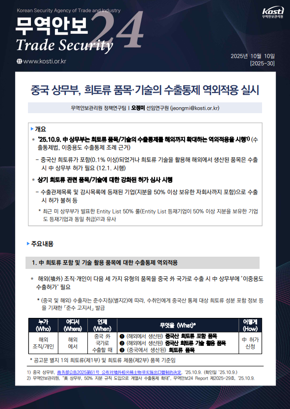 중국 상무부, 희토류 품목·기술의 수출통제 역외적용 실시