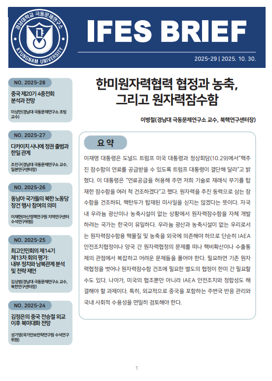 이재명 대통령은 도널드 트럼프 미국 대통령과 정상회담(10.29)에서“핵추진 잠수함의 연료를 공급받을 수 있도록 트럼프 대통령이 결단해 달라”고 밝혔다. 이 대통령은 “연료공급을 허용해 주면 저희 기술로 재래식 무기를 탑재한 잠수함을 여러 척 건조하겠다”고 했다. 원자력을 추진 동력으로 삼는 잠수함을 건조하되, 핵탄두가 탑재된 미사일을 싣지는 않겠다는 뜻이다. 자국 내 우라늄 광산이나 농축시설이 없는 상황에서 원자력잠수함을 자체 개발하려는 국가는 한국이 유일하다. 우라늄 광산과 농축시설이 없는 우리로서는 원자력잠수함용 핵물질 및 농축을 외국에 의존해야 하므로 단순히 IAEA 안전조치협정이나 양국 간 원자력협정의 문제를 떠나 핵비확산이나 수출통제의 관점에서 복잡하고 어려운 문제들을 풀어야 한다. 필요하면 기존 원자력협정을 벗어나 원자력잠수함 건조에 필요한 별도의 협정이 한미 간 필요할 수도 있다. 나아가, 미국의 협조뿐만 아니라 IAEA 안전조치와 정합성도 해결해야 할 과제이다. 특히, 외교적으로 중국을 포함하는 주변국 반응 관리와 국내 사회적 수용성을 면밀히 검토해야 한다.