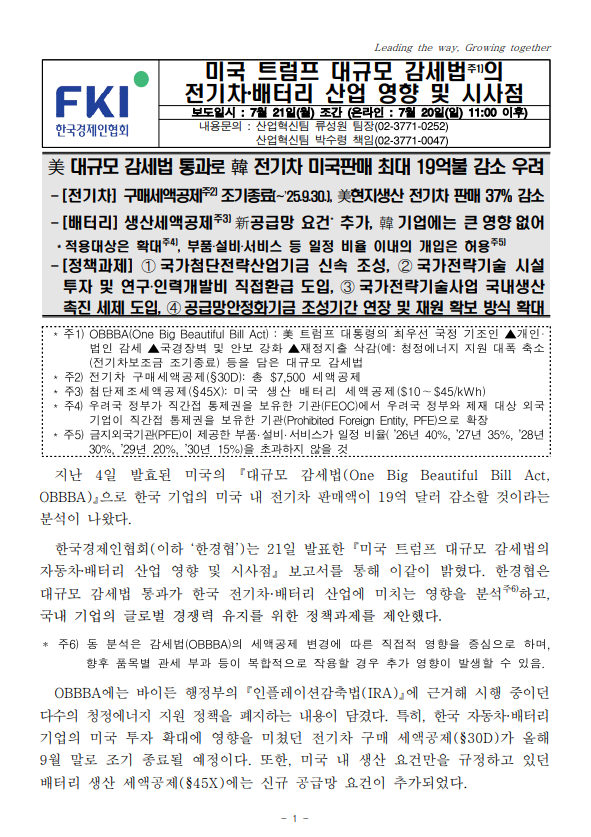 미국 트럼프 대규모 감세법의 전기차·배터리 산업 영향 및 시사점 : 美 대규모 감세법 통과로 韓 전기차 미국판매 최대 19억불 감소 우려