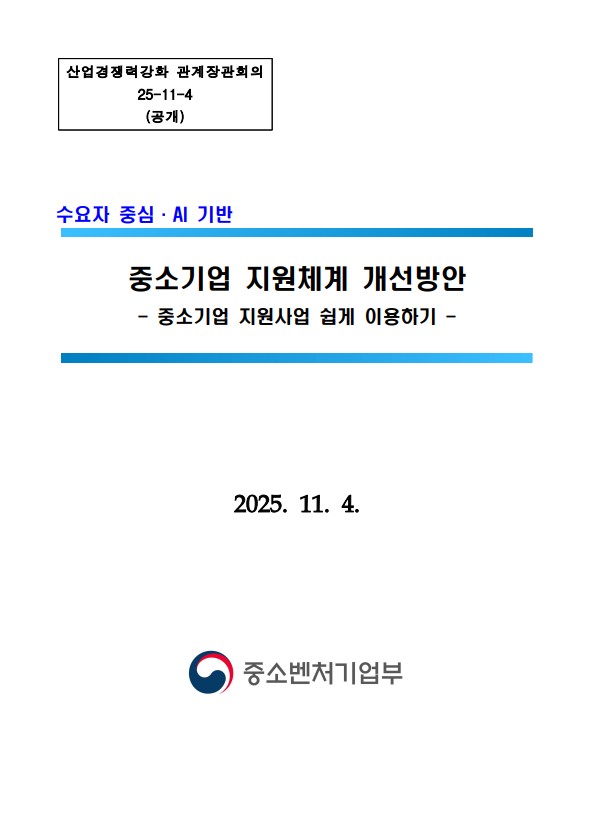 [출처] 중소기업 지원사업, 인공지능(AI)을 기반으로 쉽게 이용할 수 있게 바뀐다!, 「중소기업 지원체계 개선방안」 발표 (2025.11.04.) / 중소벤처기업부