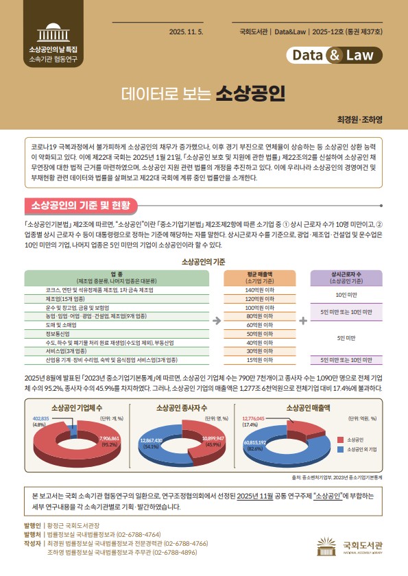 □ 국회도서관(관장 황정근)은 11월 5일(수) 소상공인의 날을 기념해 ‘데이터로 보는 소상공인'을 주제로『Data & Law』(2025-12호, 통권 제37호)를 발간함