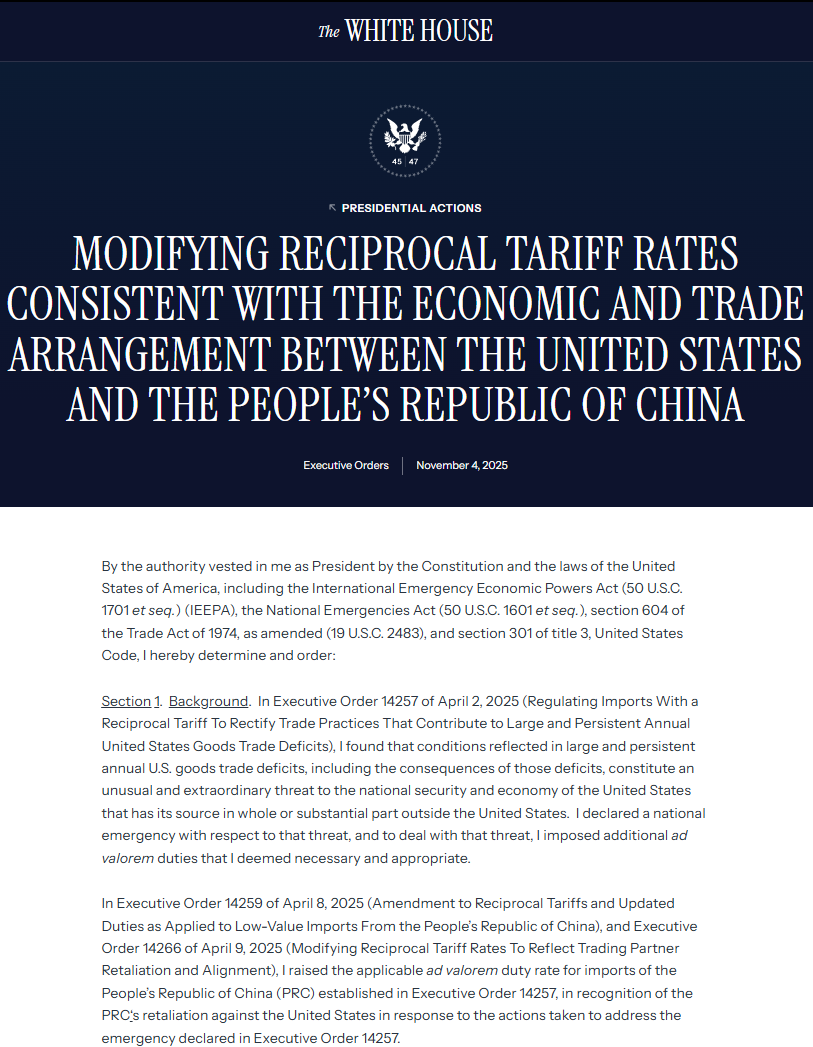 ㅇ 10월 30일 부산에서 열린 미중 정상회담 결과, 미국이 중국산 제품에 대한 고율관세 유예 조치를 2026년 11월 10일까지 1년 연장하기로 합의함