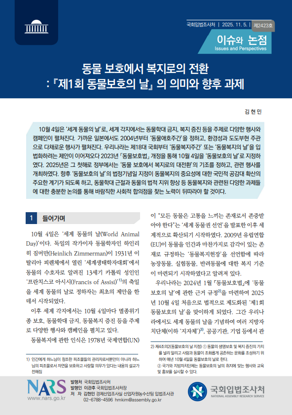 10월 4일은 ‘세계 동물의 날’로, 세계 각지에서는 동물학대 금지, 복지 증진 등을 주제로 다양한 행사와 캠페인이 펼쳐진다. 가까운 일본에서도 2004년부터 ‘동물애호주간’을 정하고, 환경성과 도도부현 주관으로 다채로운 행사가 펼쳐진다. 우리나라는 제18대 국회부터 ‘동물복지주간’ 또는 ‘동물복지의 날’을 입법화하려는 제안이 이어져오다 2023년 「동물보호법」 개정을 통해 10월 4일을 ‘동물보호의 날’로 지정하였다. 2025년은 그 첫해로 정부에서는 ‘동물 보호에서 복지로의 대전환’의 기조를 정하고, 관련 행사를 개최하였다. 향후 ‘동물보호의 날’의 법정기념일 지정이 동물복지의 중요성에 대한 국민적 공감대 확산의 주요한 계기가 되도록 하고, 동물학대 근절과 동물의 법적 지위 향상 등 동물복지와 관련된 다양한 과제들에 대한 충분한 논의를 통해 바람직한 사회적 합의점을 찾는 노력이 뒤따라야 할 것이다.