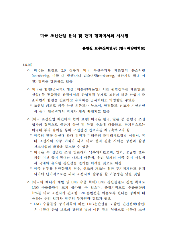 미국 조선산업 분석 및 한미 협력에서의 시사점