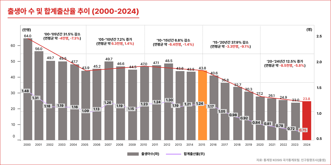 ‘인구위기’의 본질은 단순한 인구 규모의 축소가 아니라 인구 구조 변화와 그로 인한 사회에 미치는 영향에 있다. 우리나라의 출산 감소 현상은 전 세계가 주목할 만큼 놀랍도록 급격하게 진행되고 있으며, OECD 국가 중 가장 낮은 출산율을 기록한다. 2000년 한 해 64만 명이 태어났으나, 2024년에는 23.8만 명으로 약 64%가 감소하였다. 약 24년 동안 출생아 수가 1/3로 감소한 것이다.
