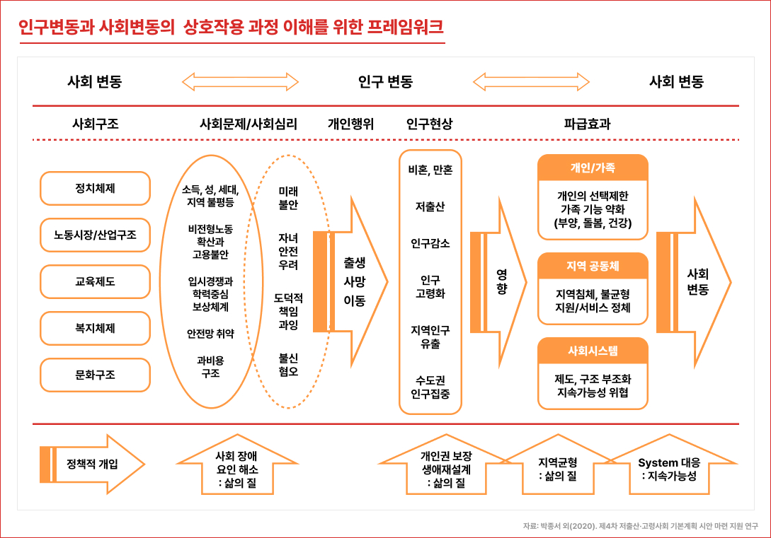 한국은 2005년 「저출산·고령사회기본법」을 제정한 이후, 5년마다 4차례 기본계획을 바탕으로 20년간 인구정책을 추진했다. 저출산·고령화로 대표되는 인구변동 대응 정책은 출생아 수 증가를 목표로 하는 인구 완화 정책과 인구변화에 적응하는 적응 정책으로 구분된다. 지난 20년간의 인구정책은 출생아 수와 출산율 증가에 초점을 둔 인구 완화 정책에 집중한 경향을 보여 왔으며, 이를 위해 결혼·출산 지원과 다자녀 양육 지원을 집중적으로 추진하였다.