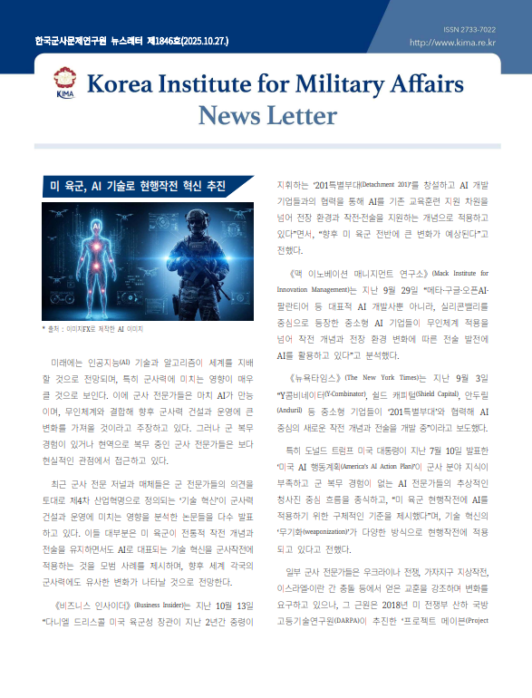 미 육군, AI 기술로 현행작전 혁신 추진