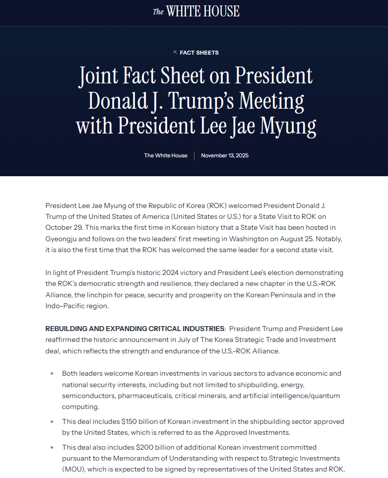 [출처] [전문] 한미, 팩트시트 확정…핵추진잠수함 건조 추진·주요품목 일괄관세 15% (2025.11.14.) / 한국일보
