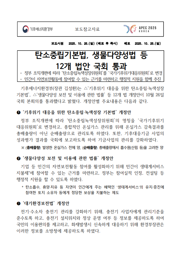탄소중립기본법, 생물다양성법 등 12개 법안 국회 통과 1