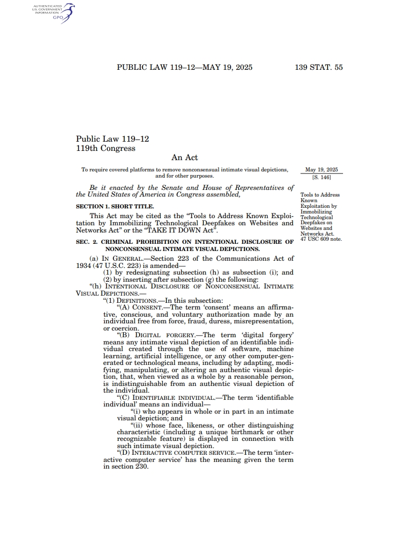 비동의 친밀 시각 묘사의 플랫폼 삭제 의무화법
