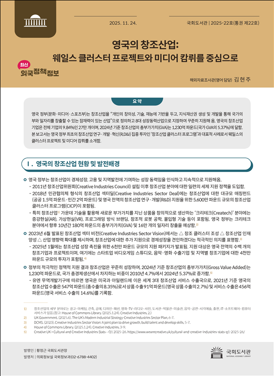 □ 국회도서관(관장 황정근)은 11월 24일(월) 영국 창조산업을 주제로 『최신외국정책정보』(2025-22호, 통권 제22호)를 발간함. 이번 호에는 웨일스 클러스터 프로젝트와 미디어 캄뤼 사례를 다룸
