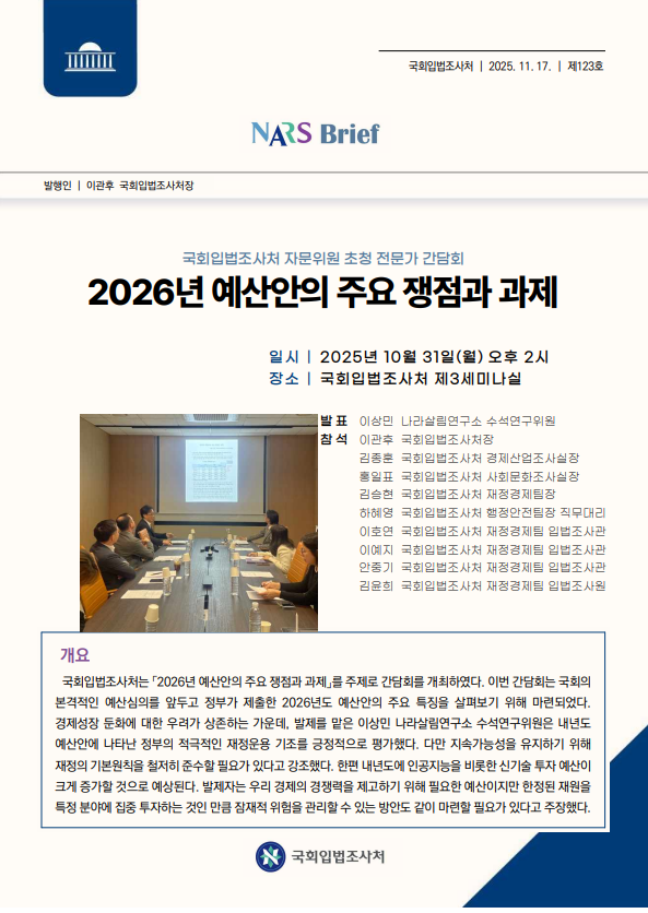 (2026년) 예산안의 주요 쟁점과 과제 : 국회입법조사처 자문위원 초청 전문가 간담회