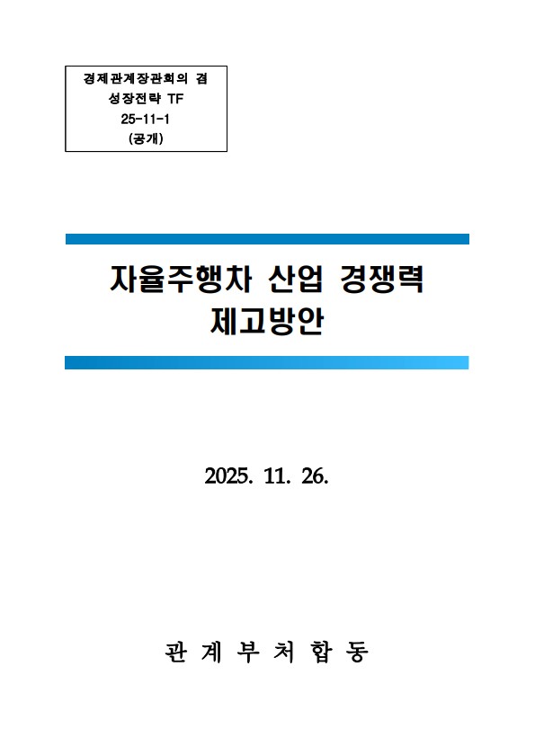 □ 정부는 11월 26일(수) 08:30 경제관계장관회의 겸 성장전략 TF에서 「자율주행차 산업 경쟁력 제고 방안」을 발표함