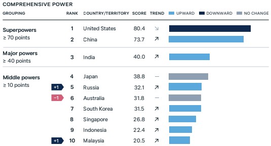 □ 호주의 싱크탱크 로위 연구소(Lowy Institute)는 2018년부터 미국과 아시아 26개국을 대상으로 매년 ‘아시아 파워 지수(Asia Power Index)’를 발표해 옴