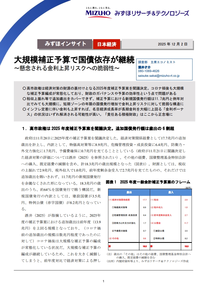 大規模補正予算で国債依存が継続: 懸念される金利上昇リスクへの脆弱性