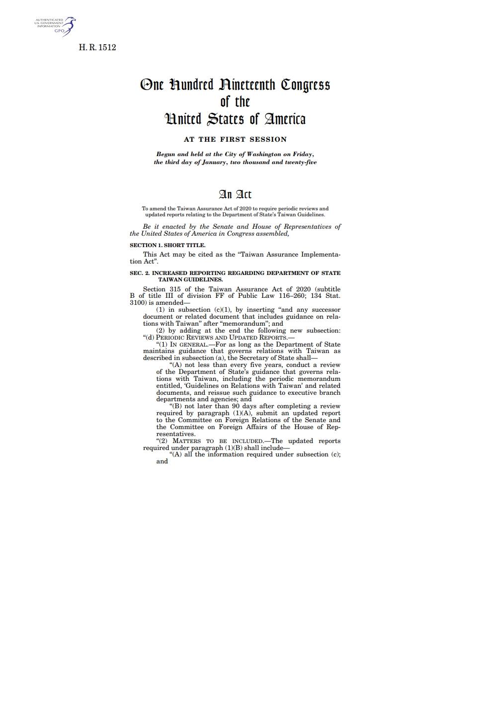 ㅇ 법안은 미 국무부가 5년마다 대만 교류 지침을 재검토하고 접촉 제한 완화 여부를 의무적으로 검토하도록 규정됨