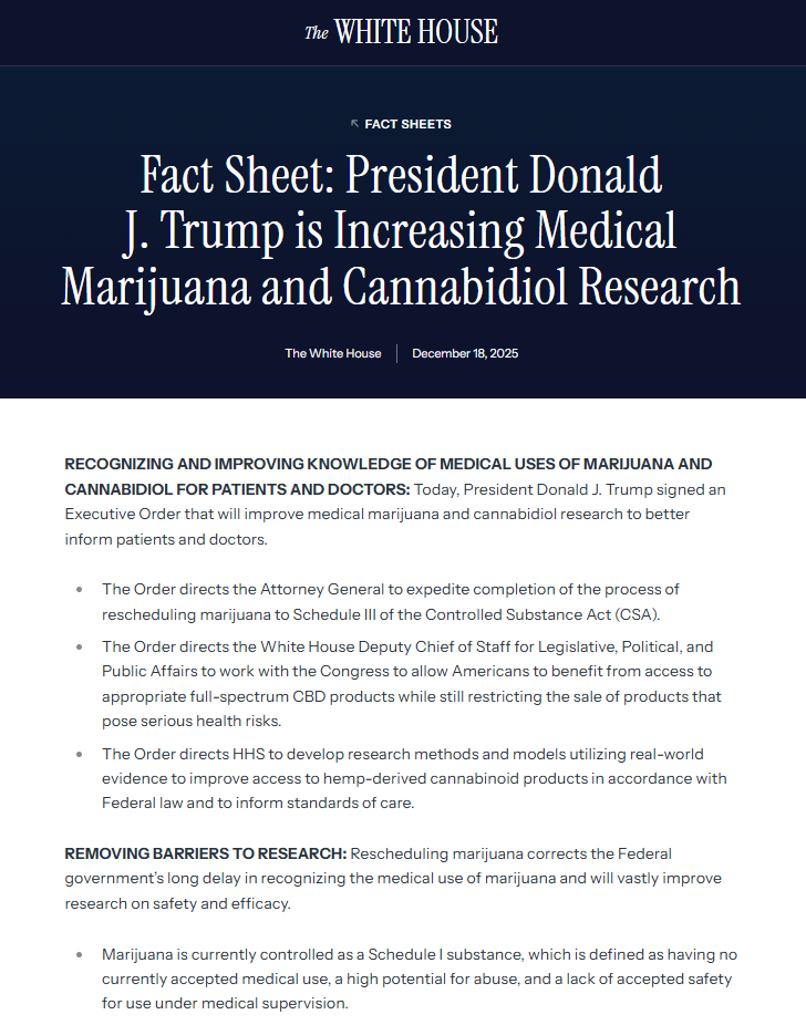 Fact Sheet: President Donald J. Trump is Increasing Medical Marijuana and Cannabidiol Research (2025.12.18.) / The White House