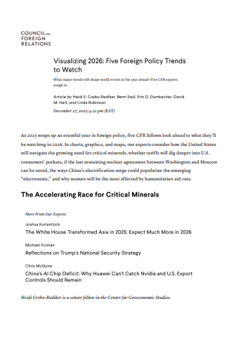 □ CFR는 2026년 국제질서를 형성할 핵심 변수로 핵심 광물 경쟁, 관세 부담 확대, 핵군비통제 붕괴, 중국 중심 에너지 전환, 해외원조 축소를 제시함