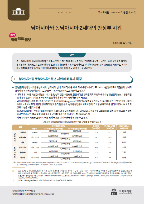 □ 국회도서관(관장 황정근)은 12월 22일(월) ‘남아시아와 동남아시아 Z세대의 반정부 시위’를 다룬 『최신외국정책정보』(2025-24호, 통권 제24호)를 발간함