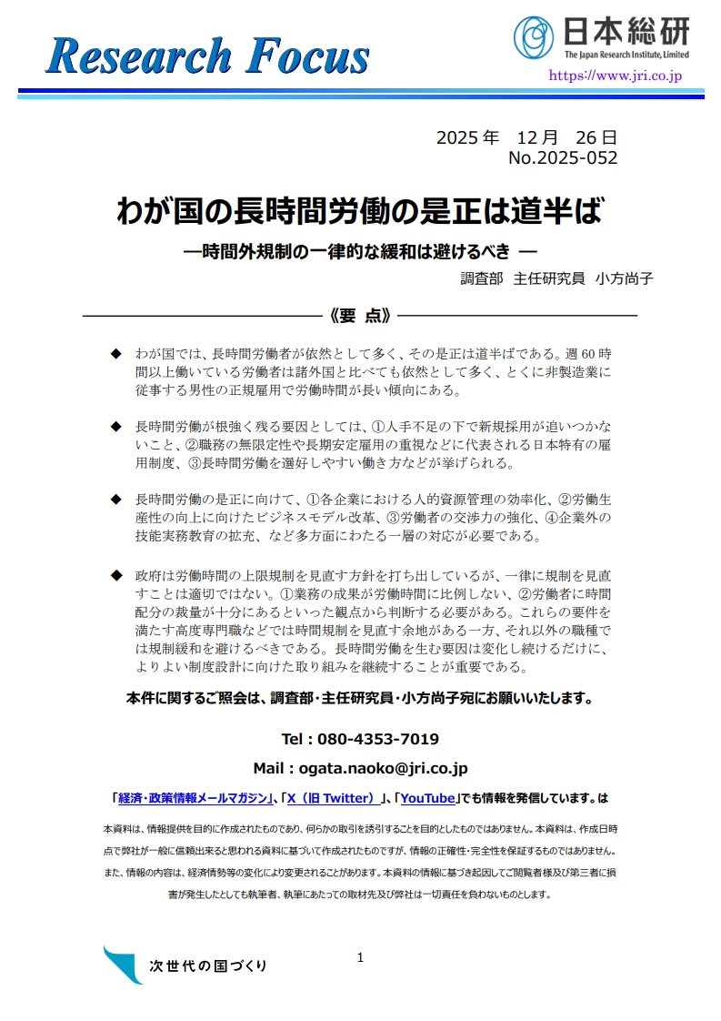 わが国の長時間労働の是正は道半ば: 時間外規制の一律的な緩和は避けるべき